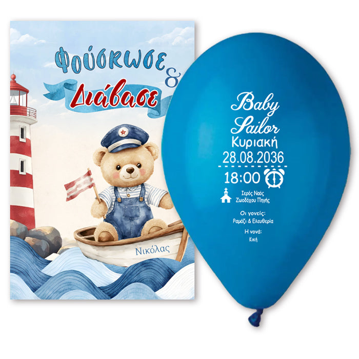 Πρωτότυπο προσκλητήριο βάπτισης σε τυπωμένο μπαλόνι με θέμα Ναυτικό Αρκουδάκι. Οι καλεσμένοι θα πρέπει να φουσκώσουν το τυπωμένο μπαλόνι για να μάθουν τις λεπτομέρειες της βάπτισης!