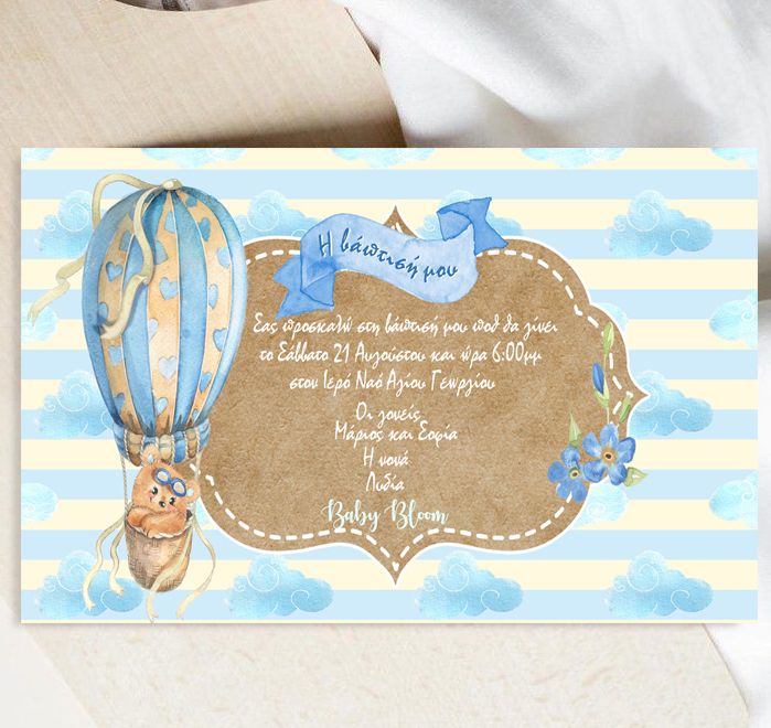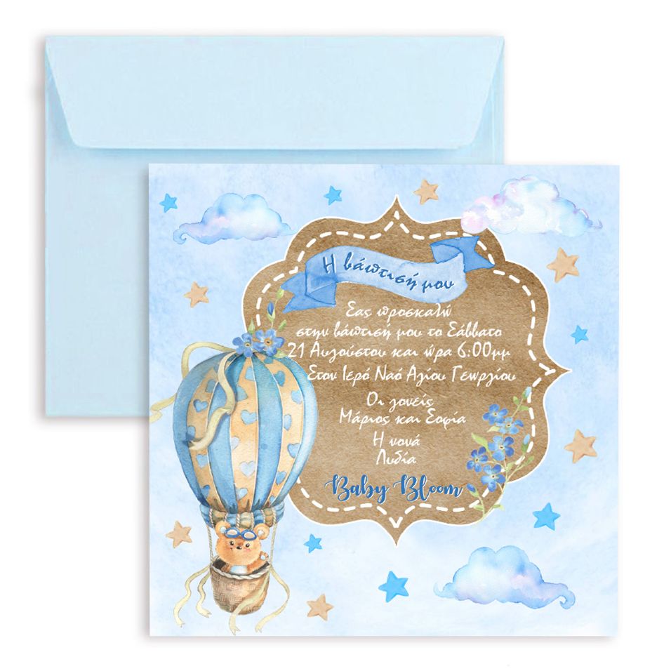 Προσκλητήριο βάπτισης σε θέμα χαριτωμένο Αερόστατο Αρκουδάκι για αγόρι, για να προσκαλέσετε τα αγαπημένα σας πρόσωπα στην βάπτιση του μωρού σας.