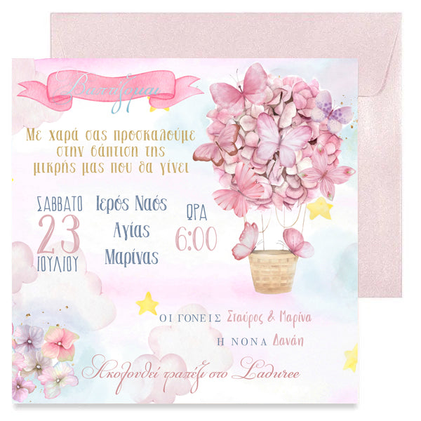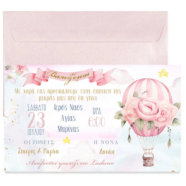 Προσκλητήριο Βάπτισης με θέμα Αερόστατο σε κοριτσίστικες αποχρώσεις για να μοιράσετε στους αγαπημένους σας καλεσμένους για τη βάπτιση του μωρού σας.