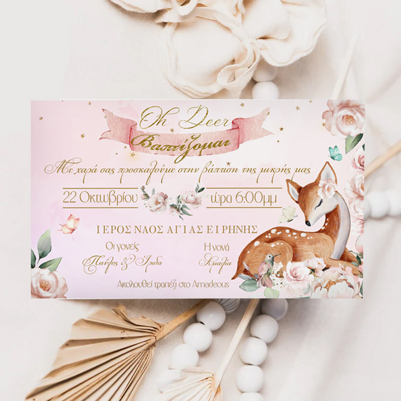 Προσκλητήριο Βάπτισης με θέμα Ελαφάκι φλοράλ, για να μοιράσετε στους αγαπημένους σας για τη βάπτιση του μωρού σας και να κλέψετε τις εντυπώσεις.