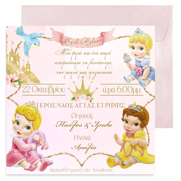 Προσκλητήριο Βάπτισης με θέμα τις Πριγκίπισσες της Disney μωράκια, σε κοριτσίστικες αποχρώσεις για να μοιράσετε στους αγαπημένους σας καλεσμένους για τη βάπτιση του μωρού σας.