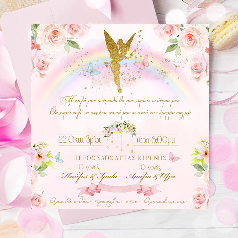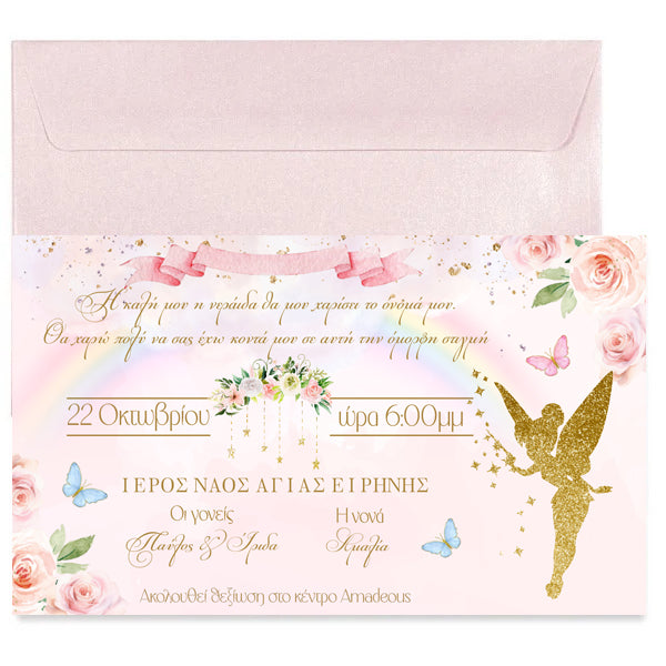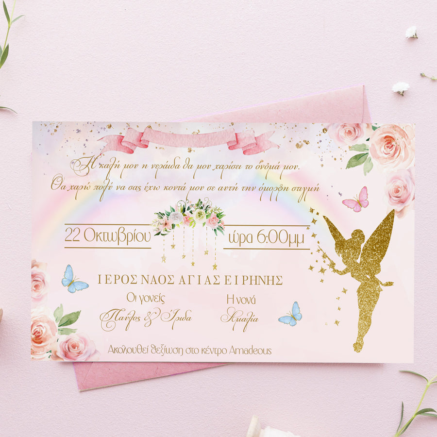 Προσκλητήριο Βάπτισης με θέμα χρυσή Νεραϊδούλα, σε κοριτσίστικες αποχρώσεις για να μοιράσετε στους αγαπημένους σας καλεσμένους για τη βάπτιση του μωρού σας.