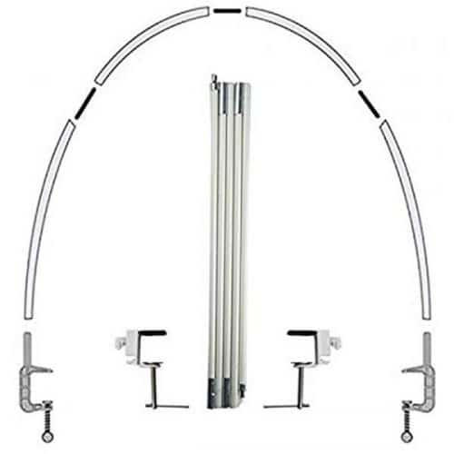 Το κουτί περιλαμβάνει 2 σφικτήρες για το τραπέζι, 5 βέργες αλουμινίου που είναι ενωμένες και δημιουργούν τόξο. Θα βρείτε και οδηγίες συναρμολόγησης με εικόνες.