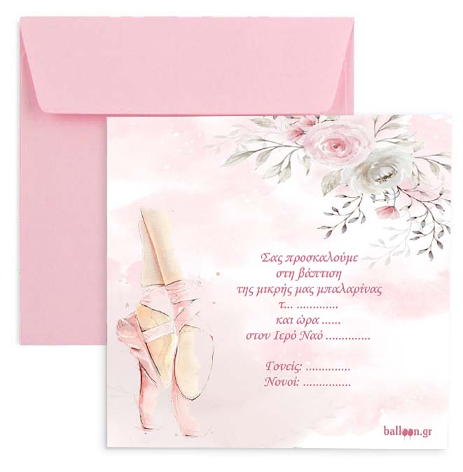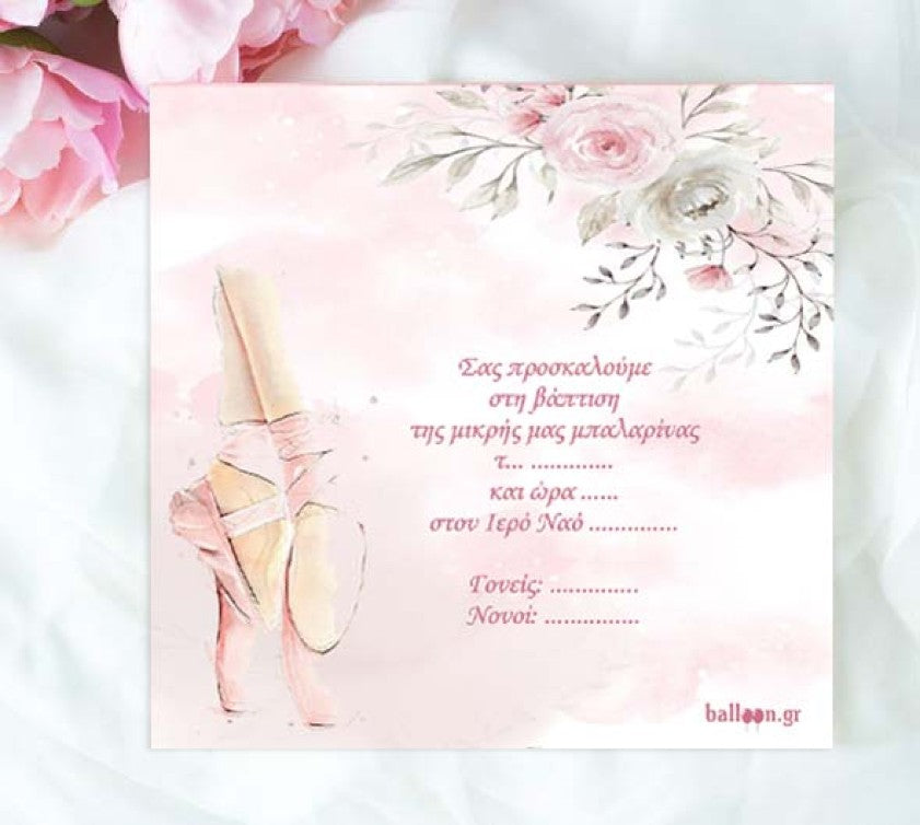 Τετράγωνο προσκλητήριο βάπτισης σε θέμα όμορφη μπαλαρίνα, για να προσκαλέσετε τα αγαπημένα σας άτομα στην βάπτιση του μωρού σας.