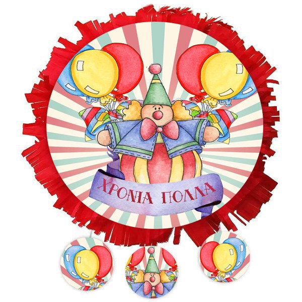 • Από την πινιάτα κρέμονται 3 στρογγυλά διακοσμητικά από χαρτόνι με τύπωμα στο θέμα της πινιάτας