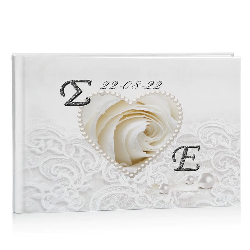 Βιβλίο Ευχών για την ημέρα του γάμου με τα αρχικά και την ημερομηνία των νεόνυμφων. Κρατήστε για πάντα τις ευχές των καλεσμένων σας σε ένα όμορφο ευχολόγιο.