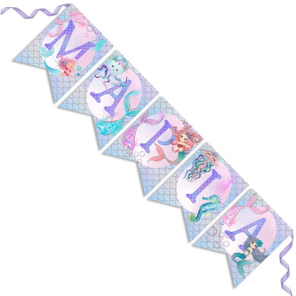 Σημαιάκια με το όνομα της μικρής σας και θέμα γοργόνα και ζωάκια της θάλασσα, για να στολίσετε το δωμάτιο ή το χώρο του πάρτυ!