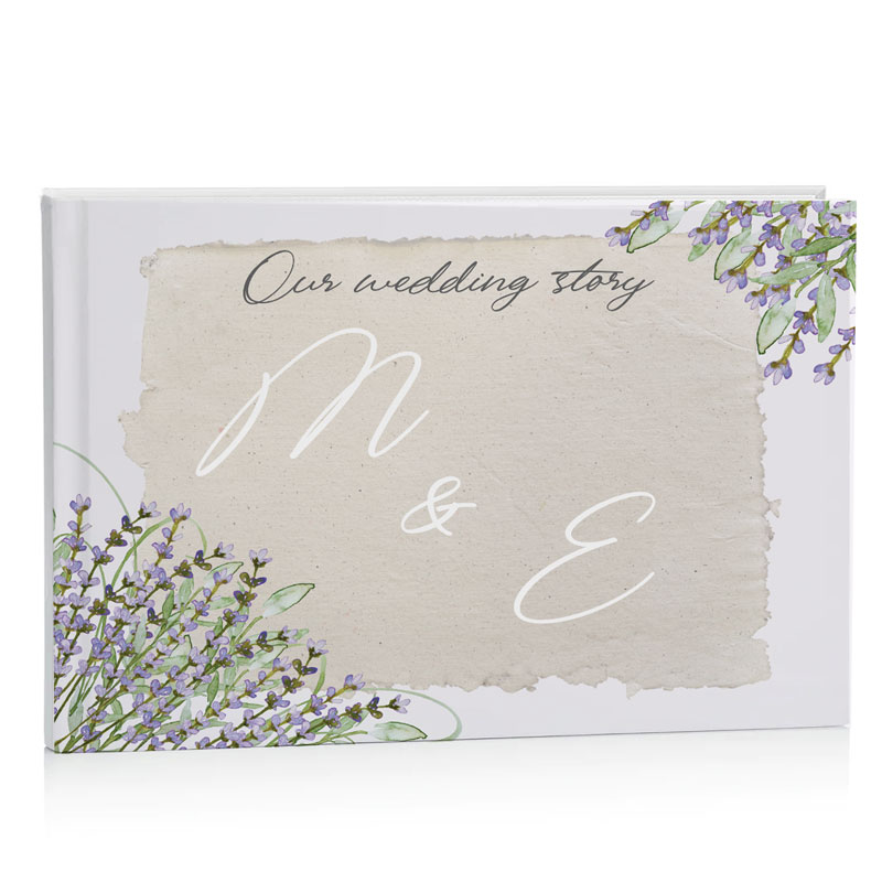 Βιβλίο Ευχών για την ημέρα του γάμου με τα αρχικά των νεόνυμφων και θέμα τη Λεβάντα. Κρατήστε για πάντα τις ευχές των καλεσμένων σας σε ένα όμορφο ευχολόγιο.