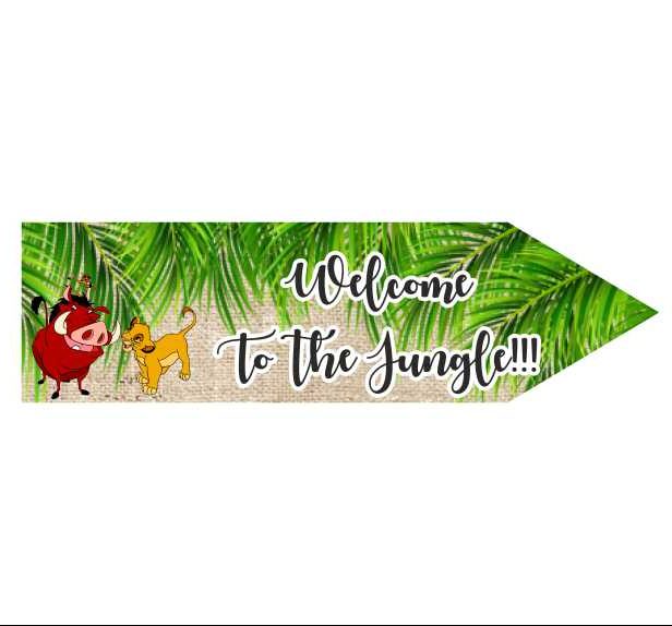 Ξύλινη διακοσμητική πινακίδα που αναγράφει "Welcome to the Junkle" για το πάρτι γενεθλίων με θέμα το Βασιλιά των λιονταριών!