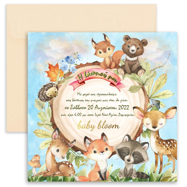 Τετράγωνο προσκλητήριο βάπτισης σε θέμα χαριτωμένα ζωάκια του δάσους, για να προσκαλέσετε τα αγαπημένα σας άτομα στην βάπτιση του μωρού σας.