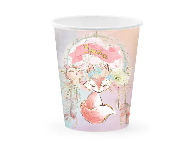 Ποτηράκια με το όνομα του παιδιού και θέμα Ονειροπαγίδα & ζωάκια Woodland, για να κεράσετε τους καλεσμένους σας!