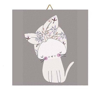 Ξύλινο καδράκι με γλυκό γατάκι που φορά γκρι κορδέλα. Διακοσμήστε όμορφα το χώρο σας ή χαρίστε το σε αγαπημένα πρόσωπα!