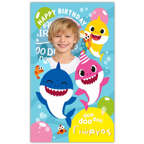 Μεγάλη αφίσα πόρτας με θέμα τα αγαπημένα Καρχαριάκια και εκτυπωμένη τη φωτογραφία του παιδιού, για να υποδεχθείτε τους φίλους σας στο πάρτι!