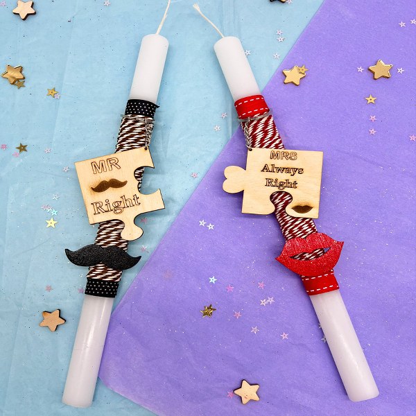 Πασχαλινές λαμπάδες για ζευγάρι με χιουμοριστικά ξύλινα διακοσμητικά μπρελόκ Mr Right & Mrs Always Right!