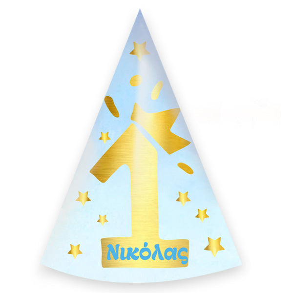 Μοιράστε στους καλεσμένους του πρώτου γενέθλιου πάρτυ του μικρού σας, καπελάκια 1st Birthday σε χρώμα γαλάζιο & χρυσό και βάλτε τους σε γιορτινή διάθεση!