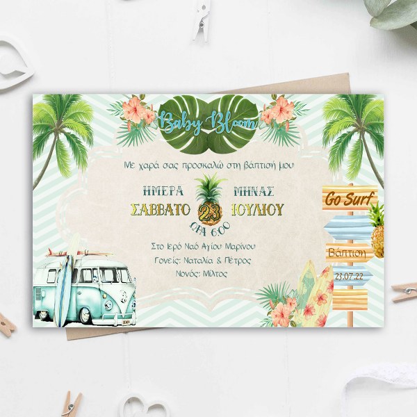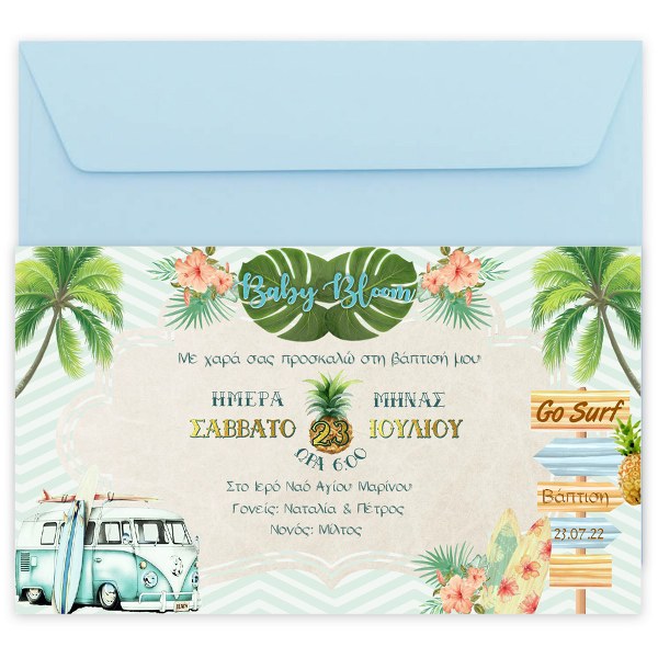 Προσκλήσεις με θέμα Tropical μαζί με γαλάζιο περλέ φάκελο. Προσκαλέστε τους αγαπημένους σας στη βάπτιση του παιδιού σας με το πιο καλοκαιρινό προσκλητήριο!