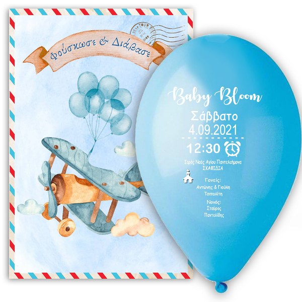 Πρωτότυπο προσκλητήριο βάπτισης σε τυπωμένο μπαλόνι με θέμα τα Ταξίδια. Οι καλεσμένοι θα πρέπει να φουσκώσουν το τυπωμένο μπαλόνι για να μάθουν τις λεπτομέρειες της βάπτισης!