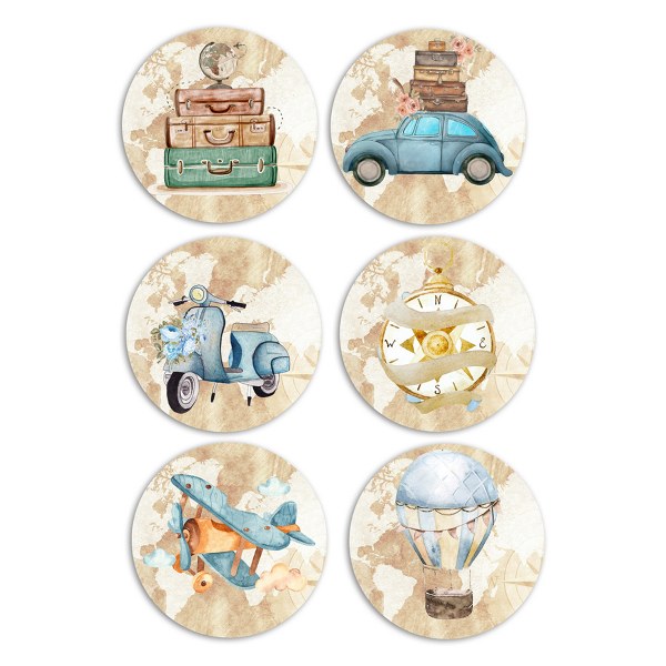 Χειροποίητες, ξύλινες κονκάρδες με θέμα τα Ταξίδια σε 6 διαφορετικά σχέδια. Φόρεσε τες με τους φίλους σου ή διακόσμησε τσάντες και ρούχα!