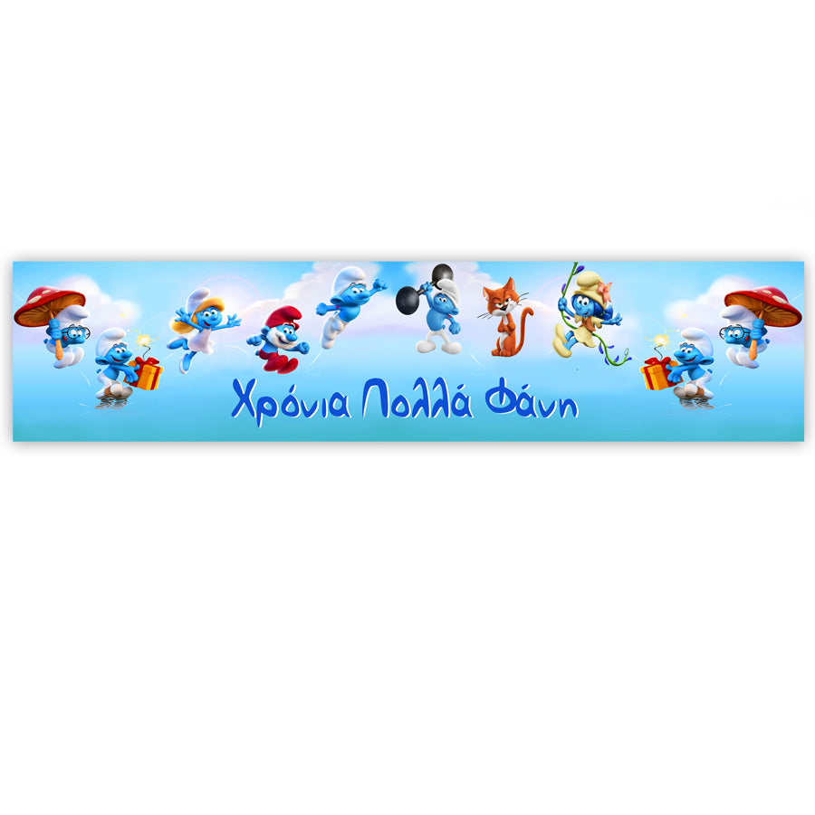 Προσωποποιημένο runner με θέματα τα Στρουμφάκια. Μπορεί να χρησιμοποιηθεί ως runner για τη διακόσμηση του τραπεζιού ή ως μπάνερ στην πόρτα ή τον τοίχο.
