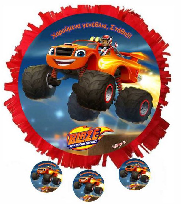 • Από την πινιάτα κρέμονται 3 στρογγυλά διακοσμητικά από χαρτόνι με τύπωμα στο θέμα της πινιάτας