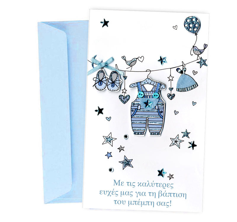 Ευχετήρια Κάρτα βάπτισης για αγοράκι με σχέδιο παιδικά ρουχαλάκια. Γράψτε τις πιο θερμές ευχές σας για το νεοφώτιστο!