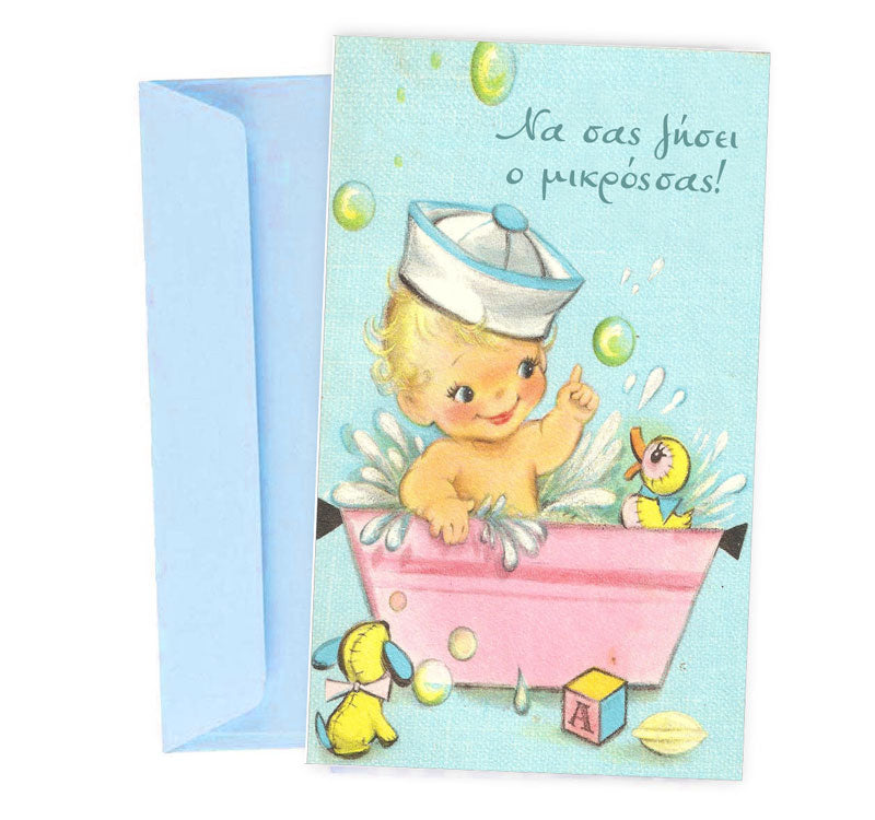 Ευχετήρια κάρτα με χαριτωμένο αγοράκι, για βάπτιση ή γέννηση.