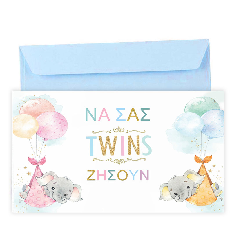 Ευχετήρια κάρτα για τη γέννηση ή τη βάπτιση Διδύμων. Γράψτε τις πιο θερμές ευχές σας σε μία όμορφη κάρτα με χαριτωμένα ελεφαντάκια.