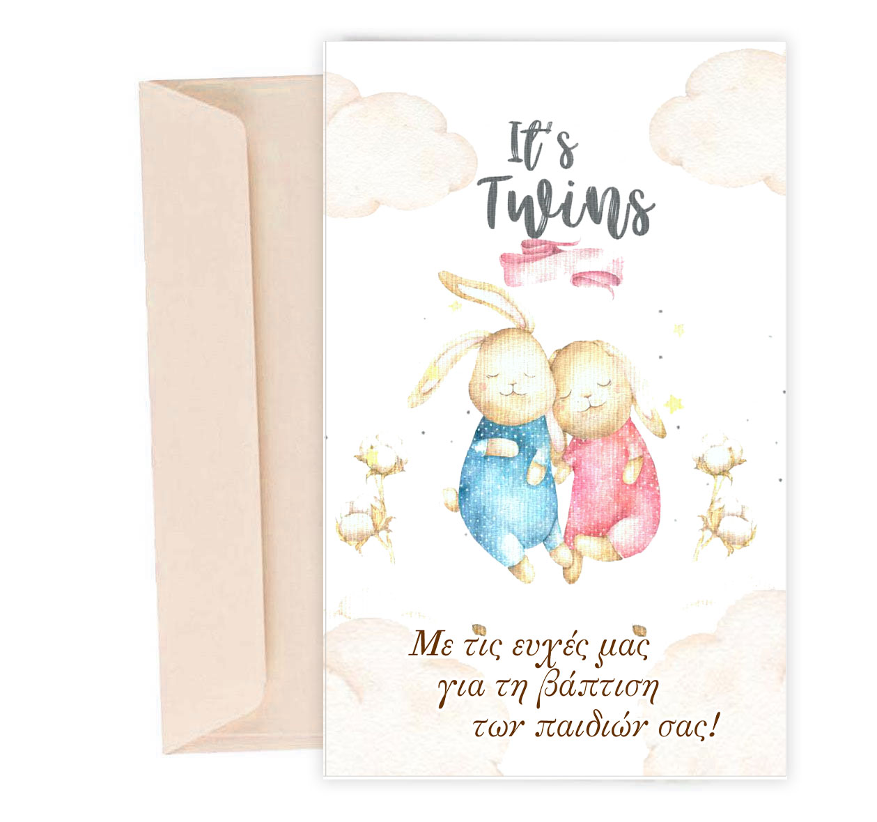 Ευχετήρια κάρτα για τη βάπτιση διδύμων - αγοράκι και κοριτσάκι! Γράψτε τις πιο θερμές ευχές σας σε μία όμορφη κάρτα με σχέδιο χαριτωμένα κουνελάκια.