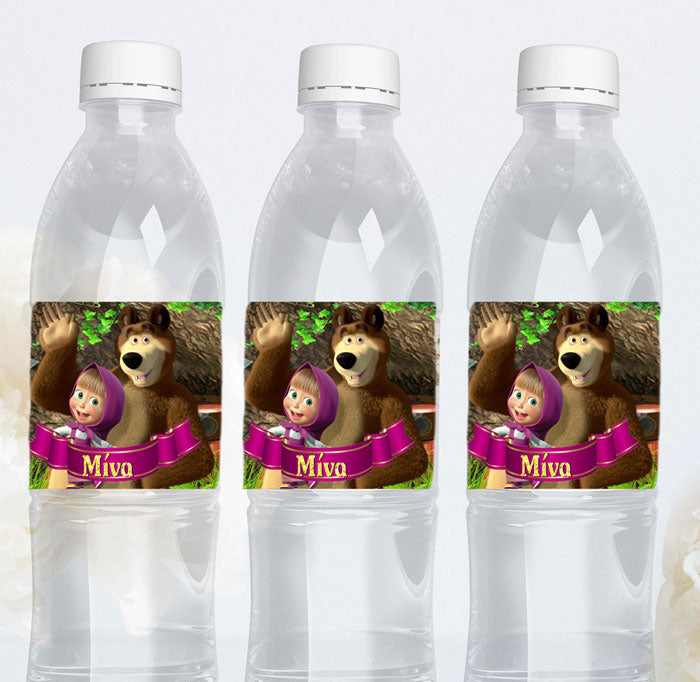 Οι καλεσμένοι δεν γίνεται να έχουν ένα κοινό μπουκάλι νερού! Μεταμορφώστε τα με ετικέτες σε θέμα Μάσα και Αρκόυδος, που μπορούν να αναγράφουν το όνομα του παιδιού του.
