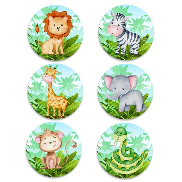 Κονκάρδες με θέμα Ζωάκια της Ζούγκλας για να φορούν οι μικροί καλεσμένοι ή για να διακοσμήσετε τα αγαπημένα σας αντικείμενα με αυτές!