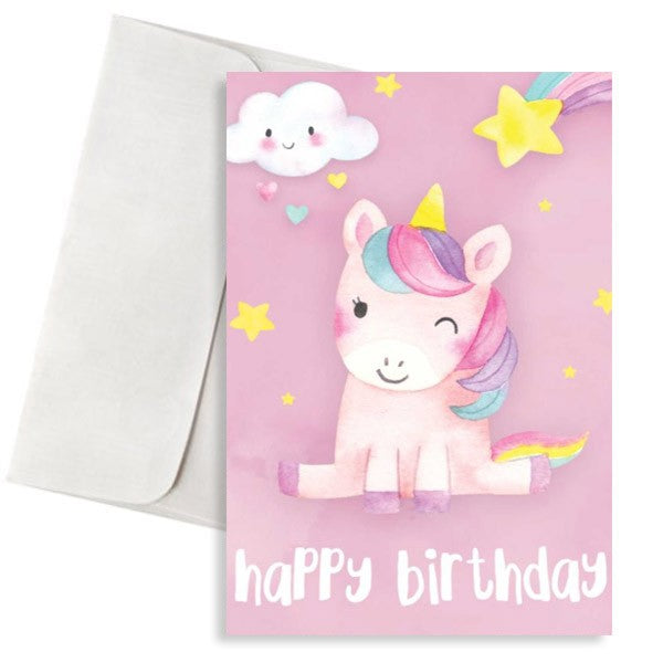 Κάρτα γενεθλίων με σχέδιο γλυκό μονοκεράκι σε ροζ αποχρώσεις, για να ευχηθείτε στα αγαπημένα σας άτομα Χρόνια Πολλά !