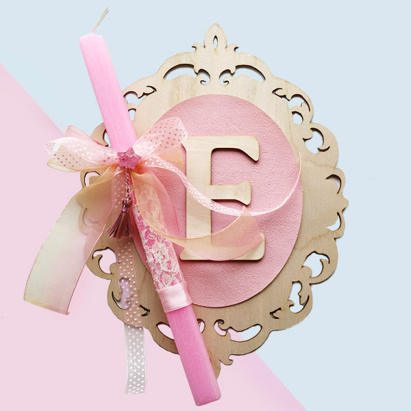 Εντυπωσιακή πασχαλινή λαμπάδα με Μονόγραμμα και μαζί ξύλινο κάδρο Καθρέφτης ροζ για τη διακόσμηση του δωμάτιου!