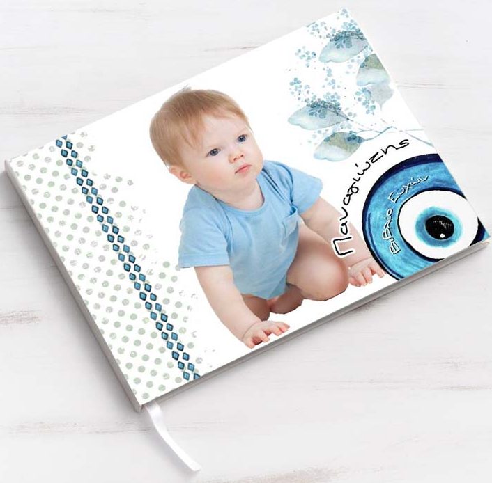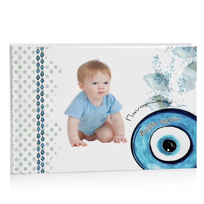 Εντυπωσιακό, χειροποίητο Βιβλίο Ευχών με θέμα Ματάκι και εκτυπωμένη τη φωτογραφία για τη Βάπτιση του μωρού σας! Κρατήστε για πάντα τις ευχές των καλεσμένων σας σε ένα όμορφο ευχολόγιο.