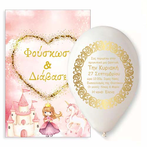Πρωτότυπο προσκλητήριο βάπτισης σε τυπωμένο μπαλόνι με θέμα την Πριγκίπισσα. Οι καλεσμένοι θα πρέπει να φουσκώσουν το τυπωμένο μπαλόνι για να μάθουν τις λεπτομέρειες της βάπτισης!