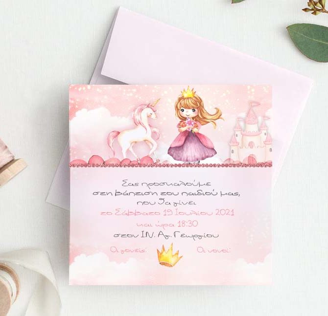 Προσκάλεστε τα αγαπημένα σας άτομα στη βάπτιση του μωρού σας με προσκλητήριο σε θέμα Πριγκίπισσα & Μονόκερος!