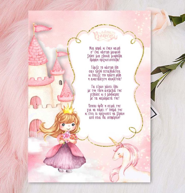 Μονόκαρτο προσκλητήριο με θέμα Πριγκίπισσα & Μονόκερος, για να καλέσετε τα αγαπημένα σας άτομα στη βάπτιση του μωρού σας!
