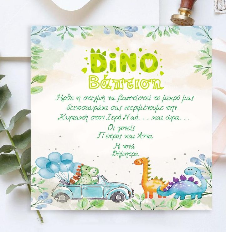Τετράγωνο προσκλητήριο βάπτισης σε θέμα χαριτωμένα Δεινοσαυράκια, για να προσκαλέσετε τα αγαπημένα σας άτομα στην βάπτιση του μωρού σας.