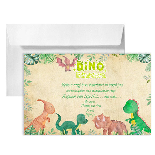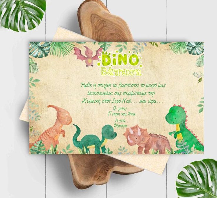Προσκλητήριο βάπτισης με θέμα χαριτωμένα δεινοσαυράκια, για να πορσκαλέσετε τα αγαπημένα σας άτομα στη βάπτιση του μικρού σας.
