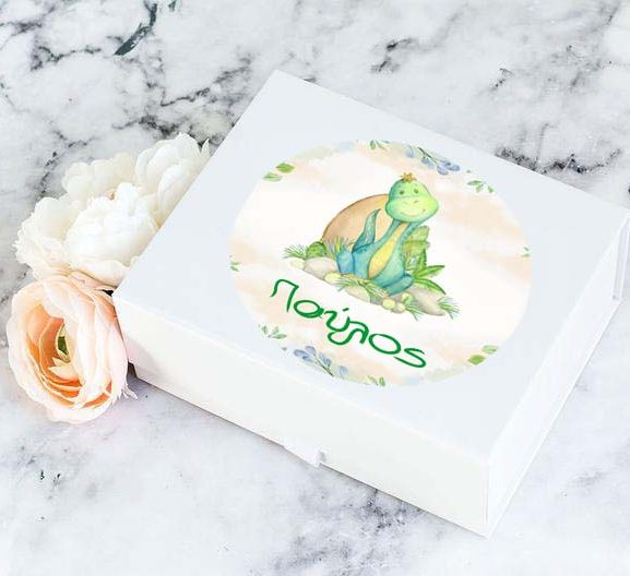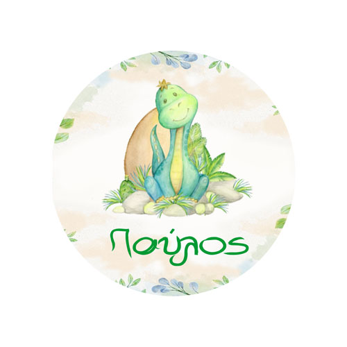 Στρογγυλά προσωποποιημένα αυτοκόλλητα με χαριτωμένο Δεινοσαυράκι. Μπορείτε να τα χρησιμοποιήσετε σε κουτάκια μπομπονιέρας, σε μπουκάλια και ποτήρια ή σε οποιοδήποτε άλλο αντικείμενο θέλετε να διακοσμήσετε για τη βάπτιση ή το πάρτυ.