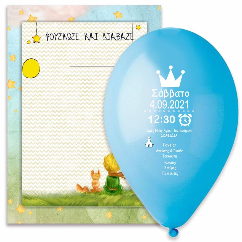 Πρωτότυπο προσκλητήριο βάπτισης σε τυπωμένο μπαλόνι με θέμα τον Μικρό Πρίγκιπα. Οι καλεσμένοι θα πρέπει να φουσκώσουν το τυπωμένο μπαλόνι για να μάθουν τις λεπτομέρειες της βάπτισης!