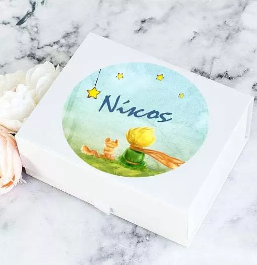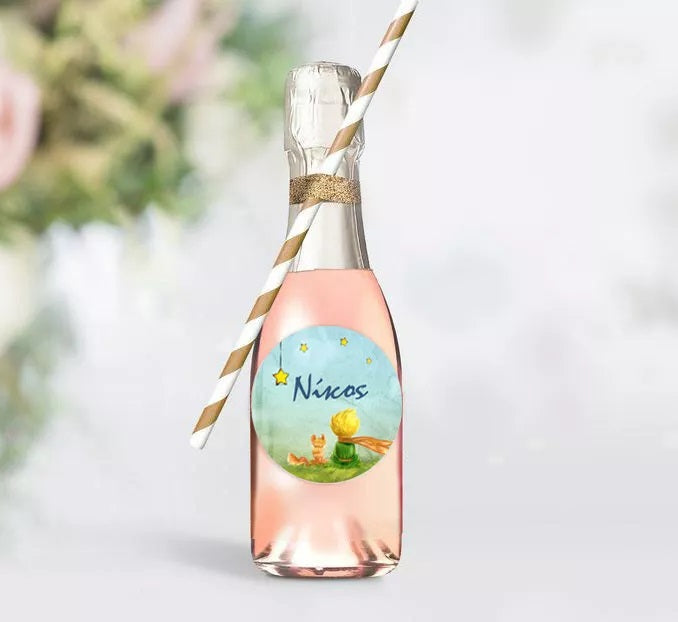 Στρογγυλά προσωποποιημένα αυτοκόλλητα με τον Μικρό Πρίγκιπα. Μπορείτε να τα χρησιμοποιήσετε σε κουτάκια μπομπονιέρας, σε μπουκάλια και ποτήρια ή σε οποιοδήποτε άλλο αντικείμενο θέλετε να διακοσμήσετε για τη βάπτιση ή το πάρτυ.