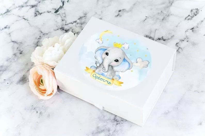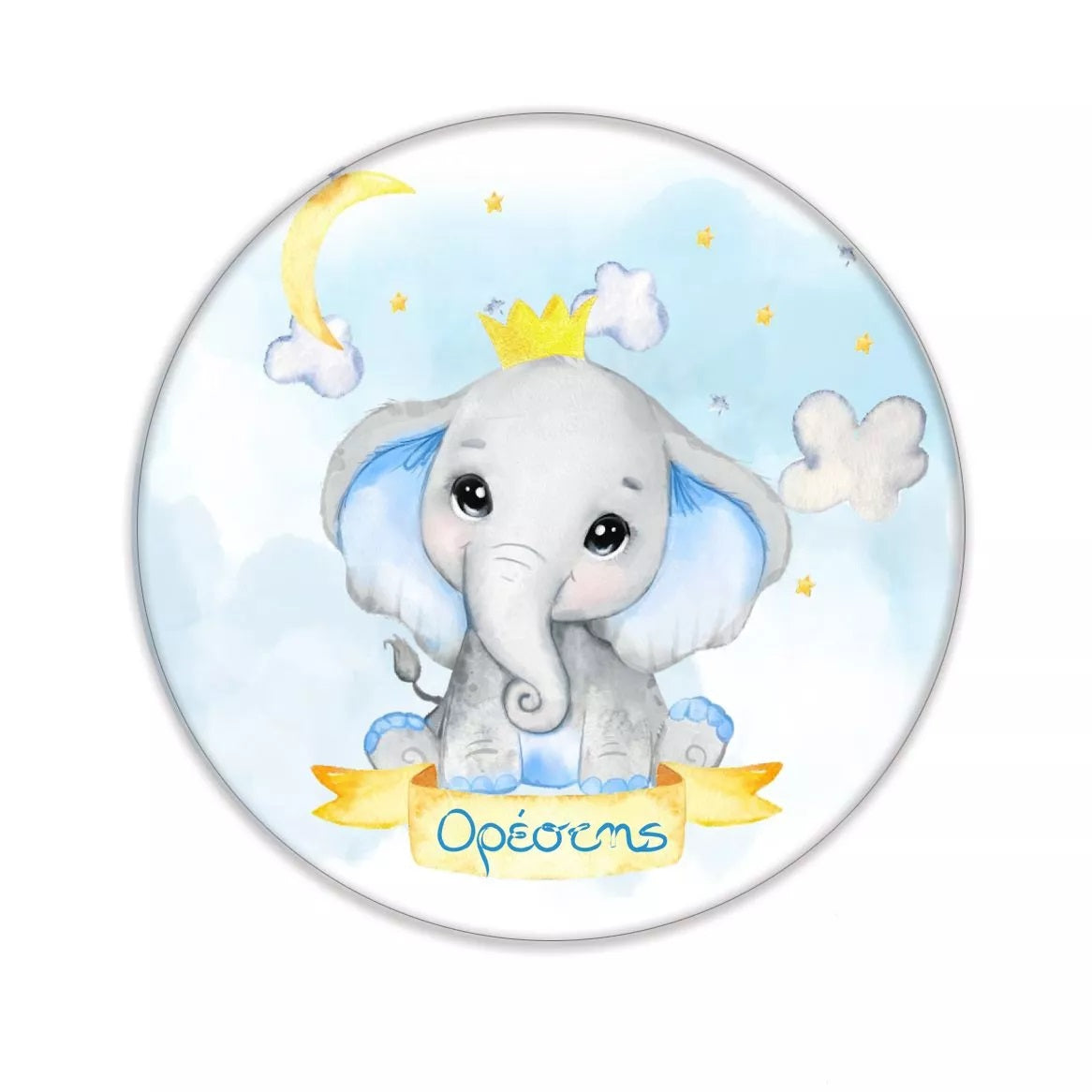 Στρογγυλά προσωποποιημένα αυτοκόλλητα με το Ελεφαντάκι. Μπορείτε να τα χρησιμοποιήσετε σε κουτάκια μπομπονιέρας, σε μπουκάλια και ποτήρια ή σε οποιοδήποτε άλλο αντικείμενο θέλετε να διακοσμήσετε για τη βάπτιση ή το πάρτυ.