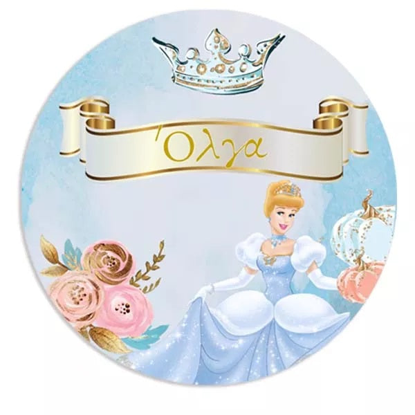 Στρογγυλά προσωποποιημένα αυτοκόλλητα με τη Σταχτοπούτα. Μπορείτε να τα χρησιμοποιήσετε σε κουτάκια μπομπονιέρας, σε μπουκάλια και ποτήρια ή σε οποιοδήποτε άλλο αντικείμενο θέλετε να διακοσμήσετε για τη βάπτιση ή το πάρτυ.