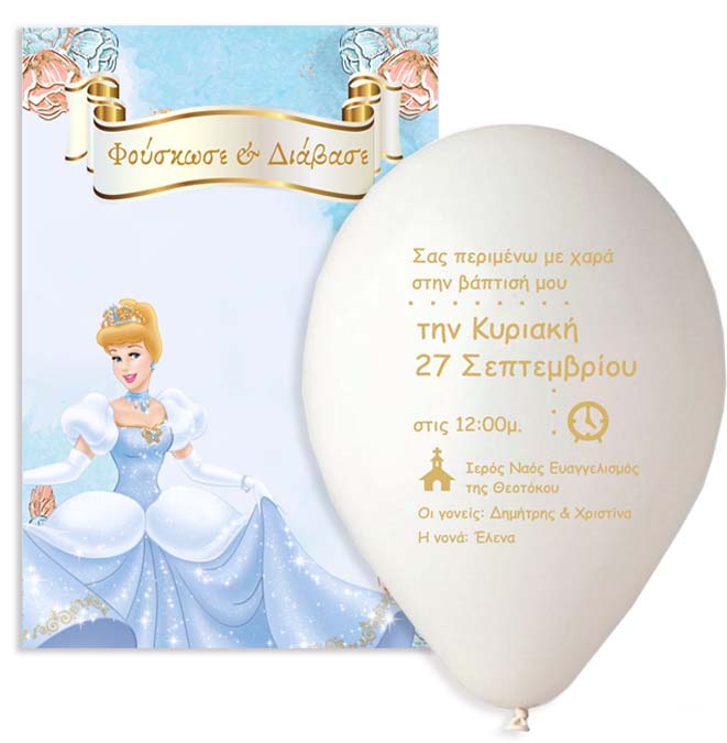 Πρωτότυπο προσκλητήριο βάπτισης σε τυπωμένο μπαλόνι με θέμα τη Σταχτοπούτα. Οι καλεσμένοι θα πρέπει να φουσκώσουν το τυπωμένο μπαλόνι για να μάθουν τις λεπτομέρειες της βάπτισης!