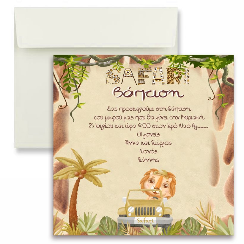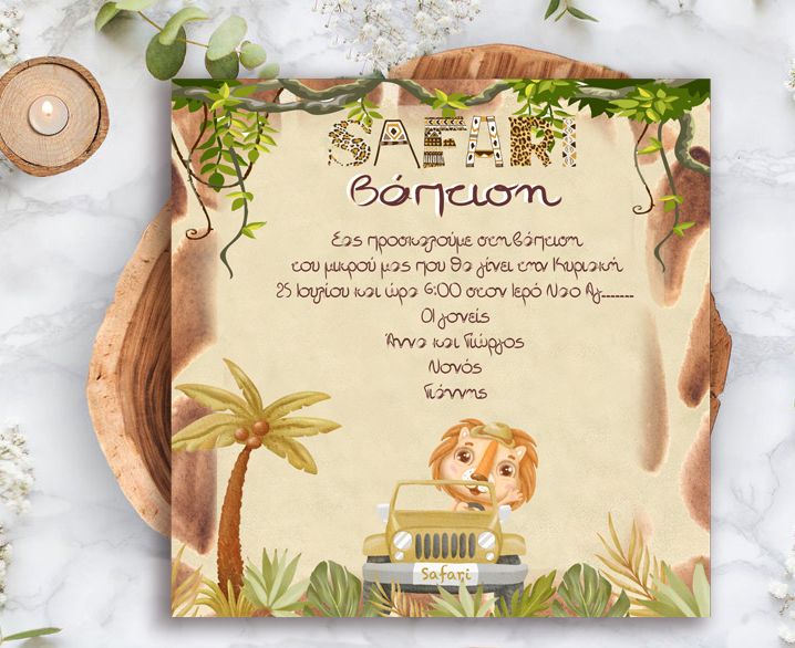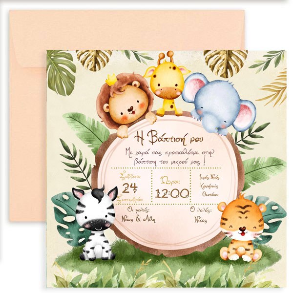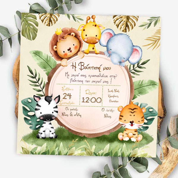 Προσκαλέστε τα αγαπημένα σας άτομα στη βάπτιση του μωρού σας με προσκλητήριο σε θέμα Σαφάρι - Ζώα της Ζούγκλας!