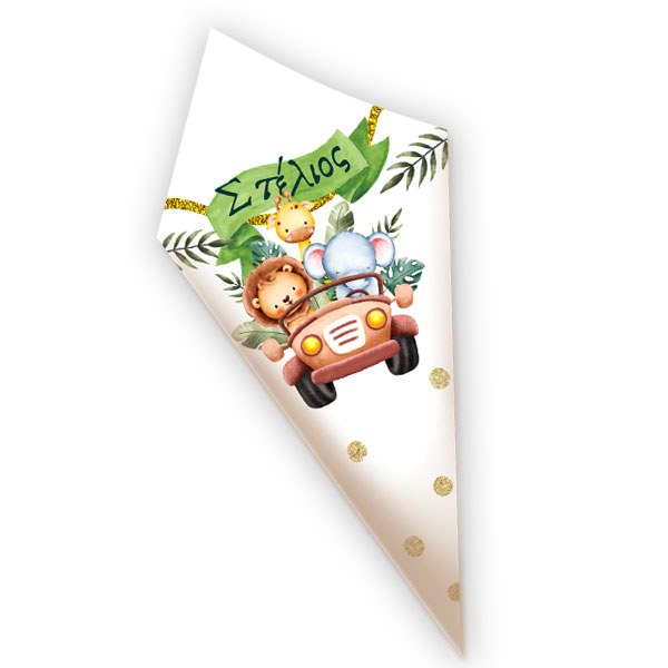 Στολίστε το candy bar ή το τραπέζι, με προσωποποιημένα χωνάκια ζαχαρωτών με θέμα χαριτωμένα ζωάκια σε περιπέτειες σαφάρι για να κεραστούν οι καλεσμένοι σας!