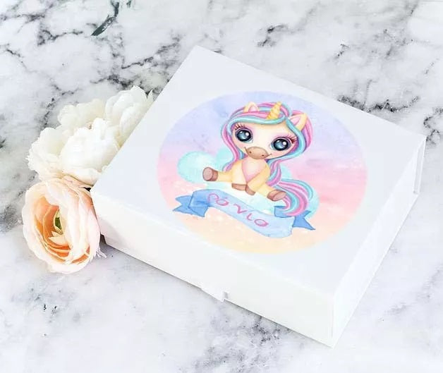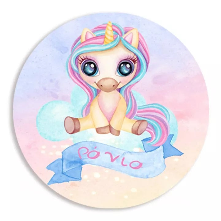 Στρογγυλά προσωποποιημένα αυτοκόλλητα με Μονοκεράκι στα χρώματα του Ουράνιου Τόξου. Μπορείτε να τα χρησιμοποιήσετε σε κουτάκια μπομπονιέρας, σε μπουκάλια και ποτήρια ή σε οποιοδήποτε άλλο αντικείμενο θέλετε να διακοσμήσετε για τη βάπτιση ή το πάρτυ.