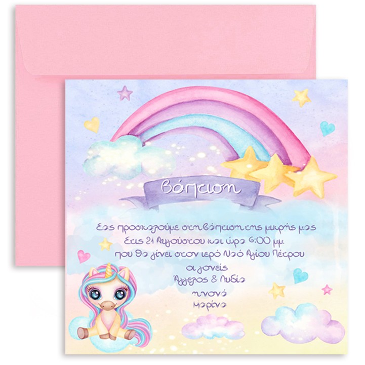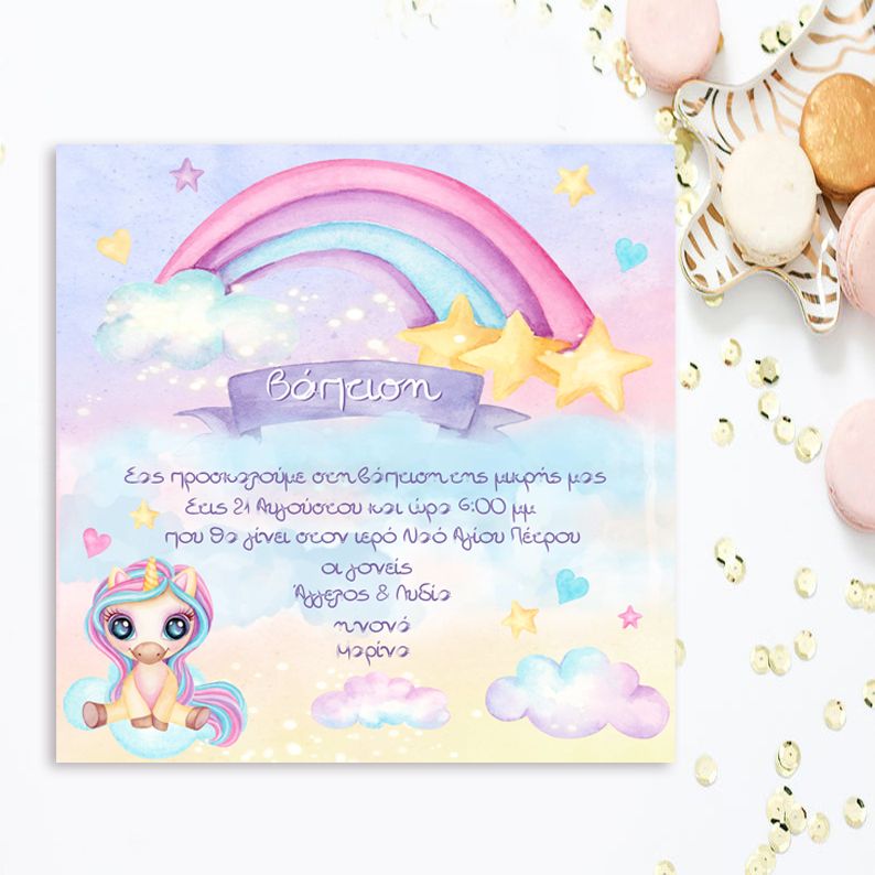 Τετράγωνο προσκλητήριο βάπτισης σε θέμα Ουράνιο Τόξο μαζί με γλυκό μονοκεράκι, για να προσκαλέσετε τα αγαπημένα σας άτομα στην βάπτιση του μωρού σας.