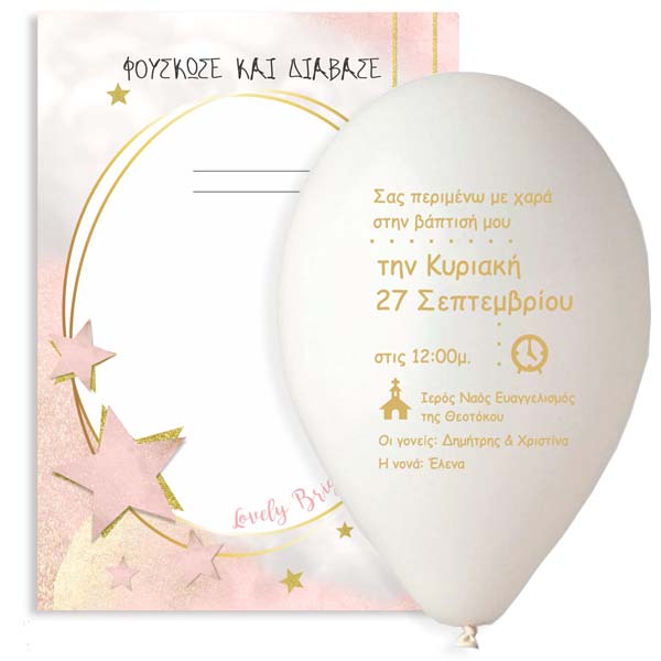 Πρωτότυπο προσκλητήριο βάπτισης σε τυπωμένο μπαλόνι με θέμα το Αστεράκι σε ροζ αποχρώσεις. Οι καλεσμένοι θα πρέπει να φουσκώσουν το τυπωμένο μπαλόνι για να μάθουν τις λεπτομέρειες της βάπτισης!