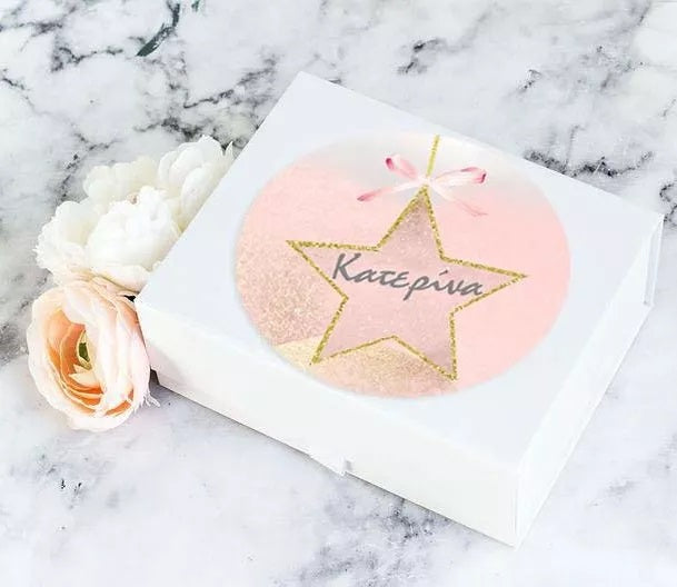 Στρογγυλά προσωποποιημένα αυτοκόλλητα με θέμα το Αστεράκι. Μπορείτε να τα χρησιμοποιήσετε σε κουτάκια μπομπονιέρας, σε μπουκάλια και ποτήρια ή σε οποιοδήποτε άλλο αντικείμενο θέλετε να διακοσμήσετε για τη βάπτιση ή το πάρτυ.